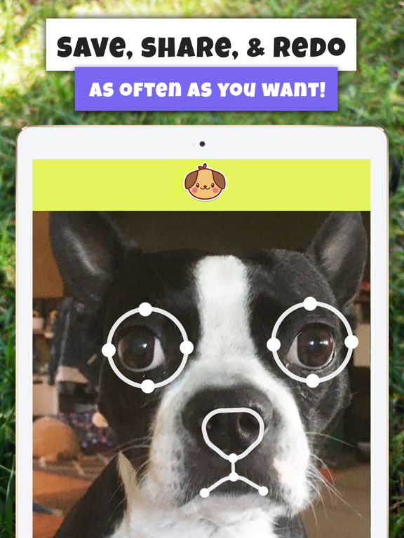 Whether you're using your talking pet animation, or just want to spice up your pet's photo, you get to choose from a collection of cute stickers to put on your pet! Add as many stickers as you want. When you're done, you can save and share your photo. Create and restart as many times as you like: with Pet Effects, you are in control.