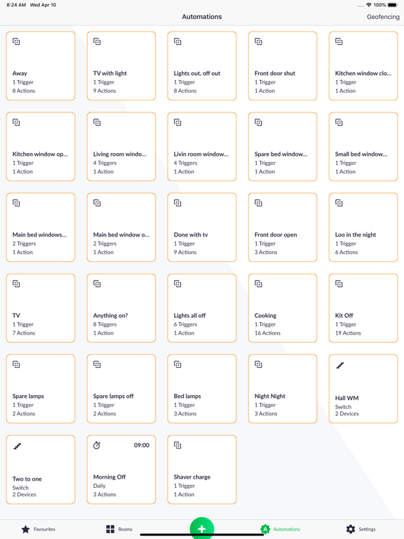 • Set Moods by room for lighting and power – for example, fully on for cleaning, some lights dimmed and the TV off for reading, and nice and cosy dimmed lights when watching TV