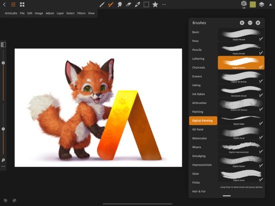 • Over 150 built-in brushes divided into multiple groups: Pens, Pencils, Oil Painting, Inking, Charcoals, Airbrushes, Watercolor and many more