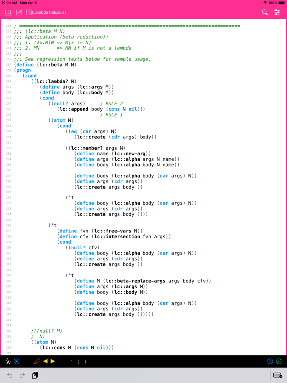 My Lisp offers an interpreter and an editor, all working on the iPhone and iPad, and
