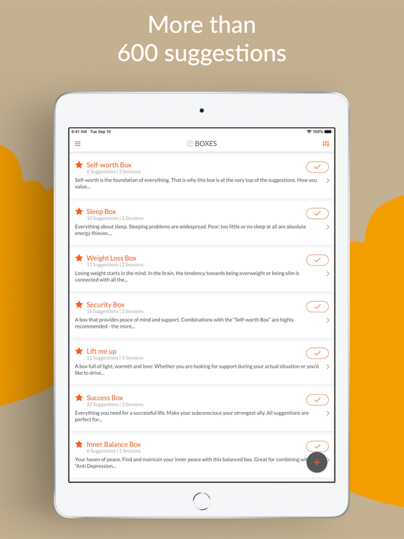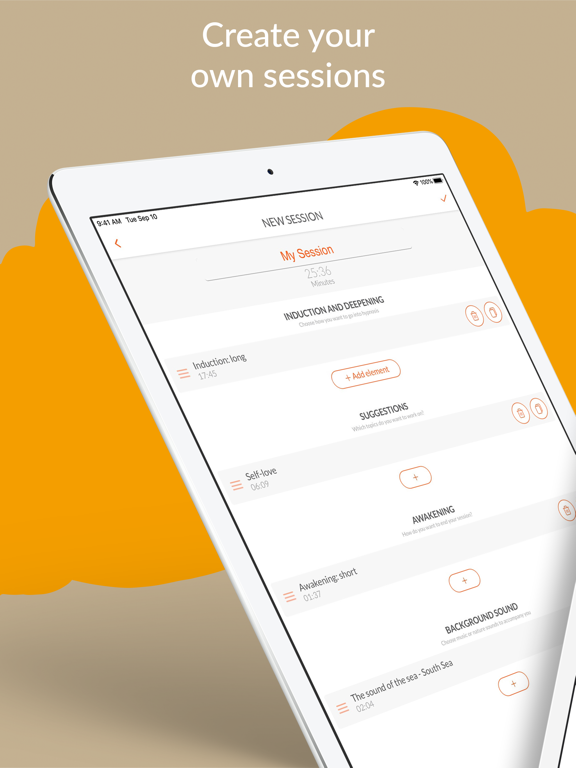 You will get 4 free sessions on "Relaxation", "Better Sleep", "Better Memory" and "Do it!". You have instant access to 9 free suggestion elements, as well as the functions of recording and importing your own audio.