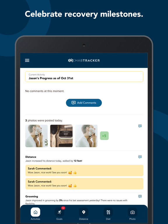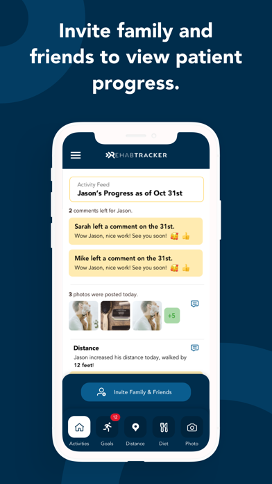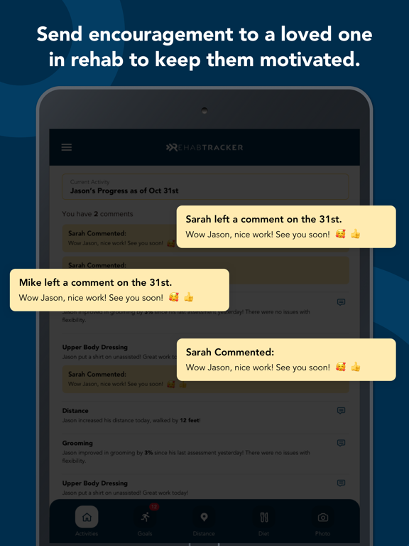 During the course of treatment, therapists set goals with patients and enter updates about their progress during therapy sessions. Patients and family members receive real-time updates through RehabTracker, involving everyone in the recovery process and increasing the likelihood that patients return home safely.