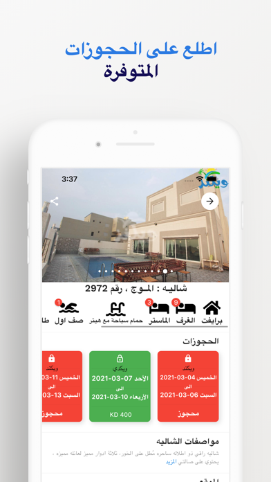 تطبيق ويكند الدليل الأول للشاليهات بالكويت يتيح للعملاء الاطلاع على الايام المتاحه للحجز موضحه بالبيانات و الصور والموقع الخاص بالشاليه .