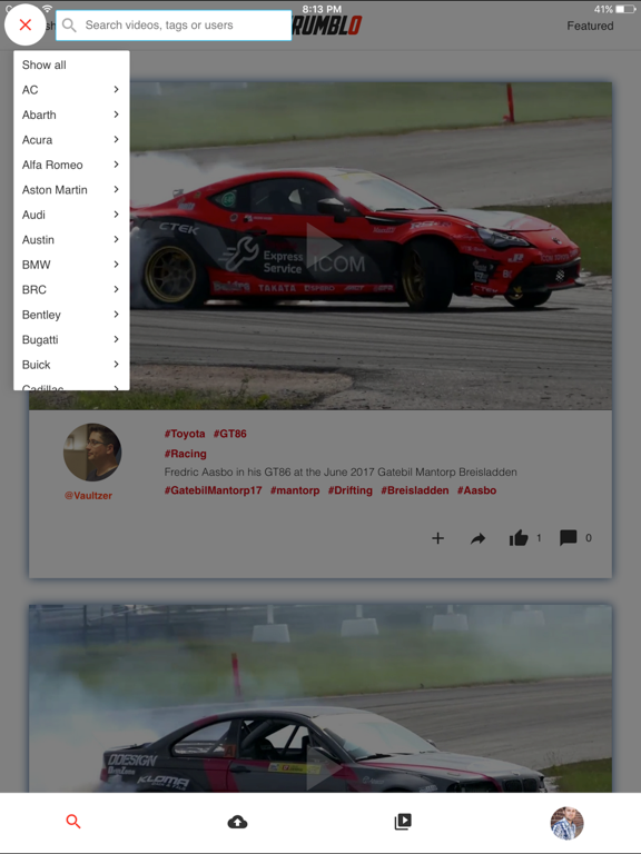 Unlike other social networks the best car sound videos in Grumblo are always at your fingertips. No need to spend hours looking for car sound videos on Youtube & video clips quickly disappearing from your Instagram feeds. Use the simple Search feature or select from the list of car brands & models.