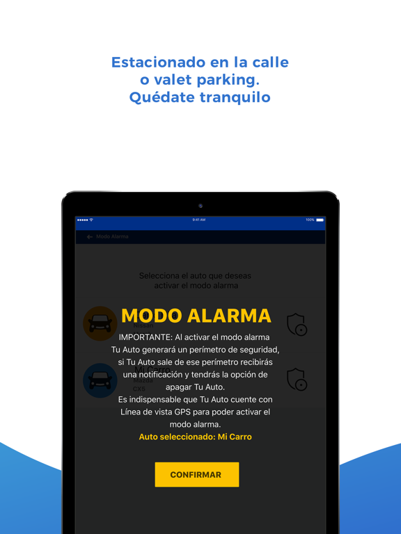 En caso de dejar tu Auto estacionado en la calle, estacionamiento público o en un valet parking, activa el modo alarma y si tu Auto es movido, recibirás una alerta que te dará la opción inmediata de apagarlo.
