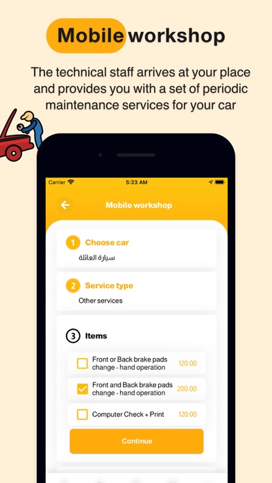 We provide the repair services at the location of our client, which includes: (changing car oil- changing brake pads- repairing belts- computer check-up)