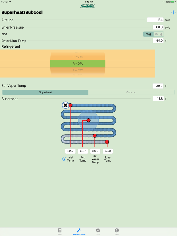 This comprehensive Pressure/Temperature calculation tool from National Refrigerants provides several unique features designed to make the HVAC/R technician’s job easier. This app can calculate a simple pressure/temperature relationship or calculate superheat/subcool temperatures. The user can input pressure or temperature(s) on any screen and the other values are automatically calculated and displayed. For refrigerant blends, both saturated vapor and saturated liquid values are displayed. Within the superheat/subcool screen, a graphic display for blends will show the entering, mid-point, and outlet temperature as well as line temperature.