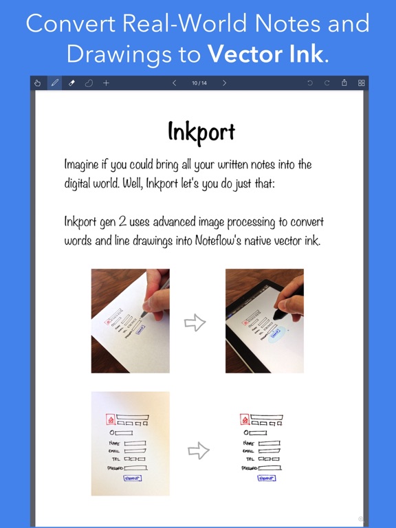 Copy and paste from the real world: Use Inkport gen 2 to snap a picture of a whiteboard or writing and convert it into Noteflow's native vector ink. No special paper needed. Then resize, re-color, or edit as if you wrote it in Noteflow.
