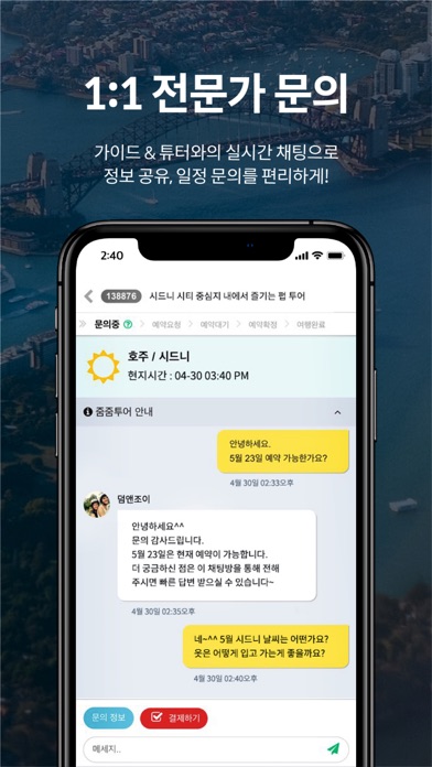 편리한 1:1 문의 기능으로 가이드/튜터/셀러와 실시간 커뮤니케이션 가능