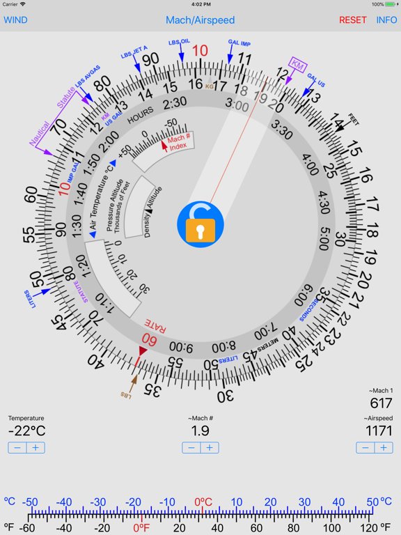 The "slide rule" or "front" side includes a circular log-log scale that can be used for multiplication, division, fuel consumption and time/speed/distance calculations. There are also various conversions available, such as nautical-miles/statute-miles/kilometers, fuel and oil volume and weight. The windows on the front are used for airspeed, various forms of "altitude' and mach number calculations.