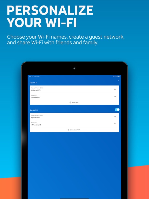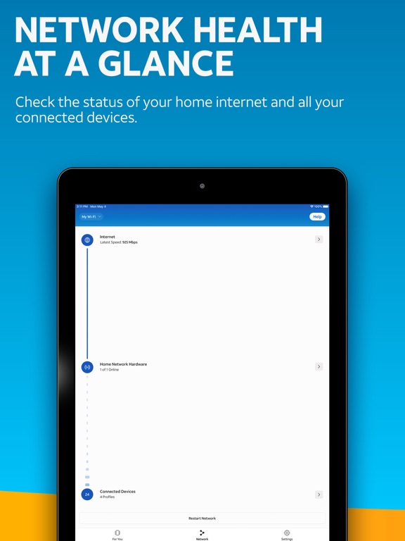 • Check your Network health, get notified of issues and service outages, restart your Wi-Fi Gateway, and more!