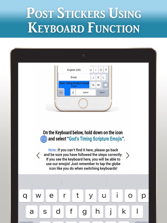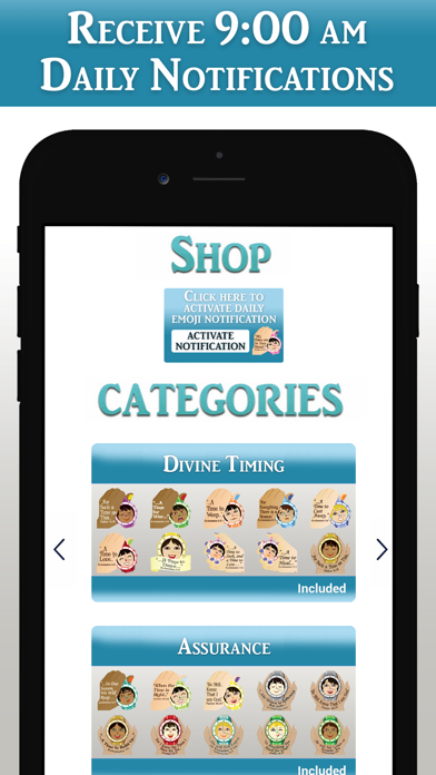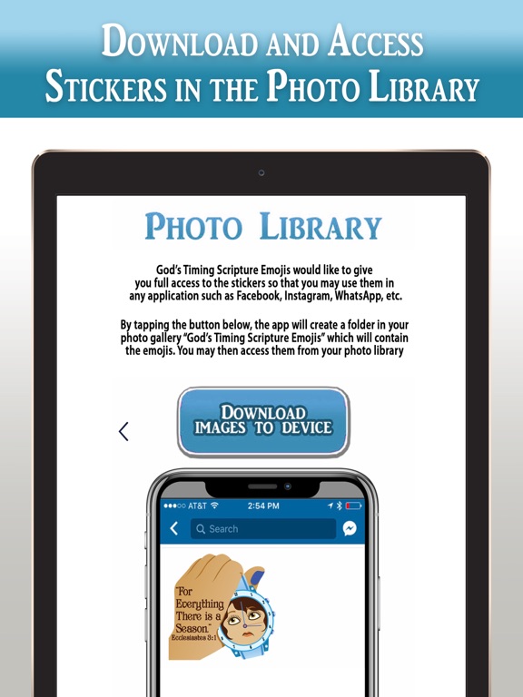 Option 2: By tapping the “Download Images to Device” button on the last page in the app. The Emoji Stickers will upload to a folder in your Photo Library called God’s Timing. You may use them in various applications, such as Facebook, Messenger, Instagram, WhatsApp, etc.