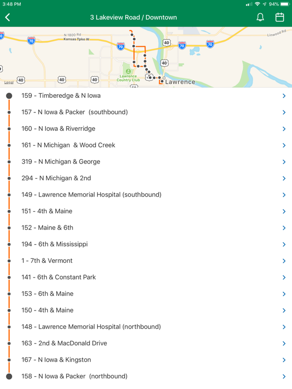 My Bus Lawrence provides real-time arrival information for the coordinated bus system operated by the City of Lawrence and The University of Kansas. View bus icons moving on a map with the route number and direction the bus is traveling. Find out when your bus will arrive by clicking on the icon or selecting your route and bus stop. Use the app to choose your favorite stops, see important announcements, or set alerts to remind you when your bus is coming.