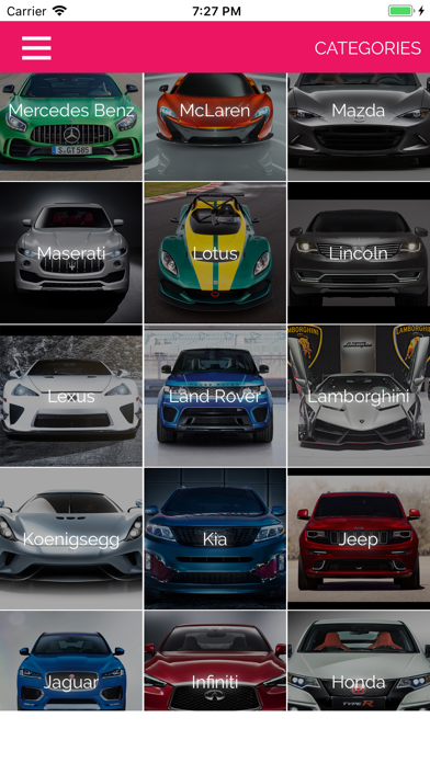 - Makes: Alfa Romeo, Aston Martin, Audi, Bentley, BMW, Bugatti, Cadillac, Chevrolet, Citroen, Dodge, Ferrari, Fiat, Ford, Honda, Infiniti, Jaguar, Jeep, Kia, Koenigsegg, Lamborghini, Land Rover, Lexus, Lincoln, Lotus, Maserati, Mazda, McLaren, Mercedes Benz, Mini, Morgan, Nissan, Pagani, Peugeot, Porsche, Renault, Rolls-Royce, Saab, Smart, Subaru, Tesla, Toyota, Volkswagen, Volvo