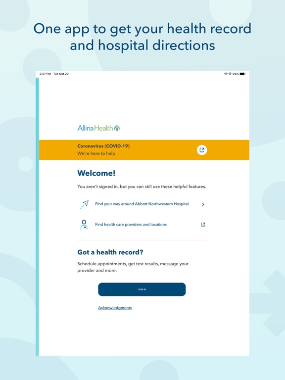 The Allina Health app puts your health information at your fingertips and makes managing your health care quick and simple. The app also gives you turn-by-turn directions on the Abbott Northwestern Hospital campus so you can confidently find your destination.