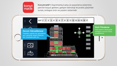 Konutmatik®; Gayrimenkul satış ve pazarlama sistemine yeni bir boyut getiren, gelişen teknoloji ile pratik çözümler sunan, entegre ürün ve yazılım sistemidir. Konutmatik Tablet (iOS App) ve Konutmatik Vizyon ürünleriyle ilgili detaylı bilgi almak için formu doldurabilirsiniz.