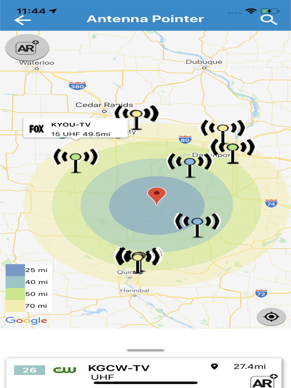 - Antenna Pointer - Use the top-down map view to locate all HDTV TV towers closest to your address or GPS location. Eliminate signal obstructions such as trees, hills, and buildings by switching to the AR view. Simply point your phone to the horizon and rotate 360 degrees to bring into view your desired TV tower and find the best angle to point your antenna. The number displayed above a tower indicates the number of channels available. Tap the tower icon to see full channel details.