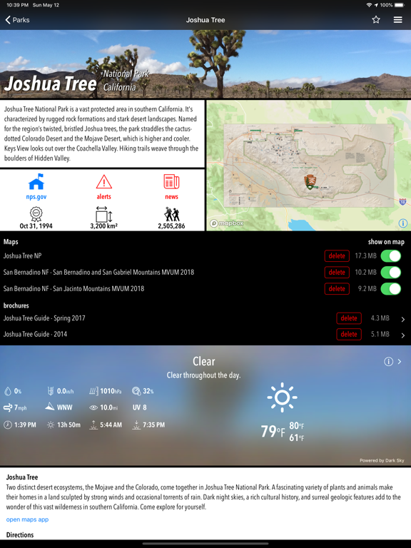 - Detailed national park information: alerts, news, visitor centers, campgrounds, driving directions, weather.
