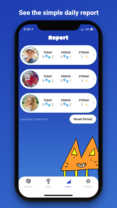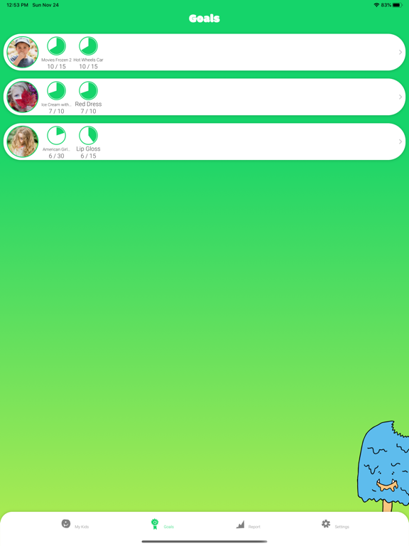 Setup as many goals / incentives for each child as you like. Once a goal is achieved an interactive fun screen pops up for your child, with the ability for parents to 'set again' that particular goal. This feature is great for recurring goals such as daily screen time.