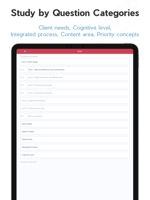* The app tracks metrics on attempted questions so you can focus on your "Knowledge" gaps