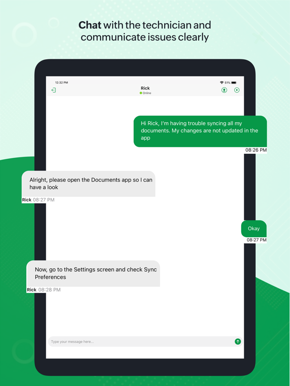 4) After going through the screens and getting an idea of the problem, the technician can communicate with you through the in-app chat. This will be ideal when the technician wants to send you instructions or ask you for quick clarifications.