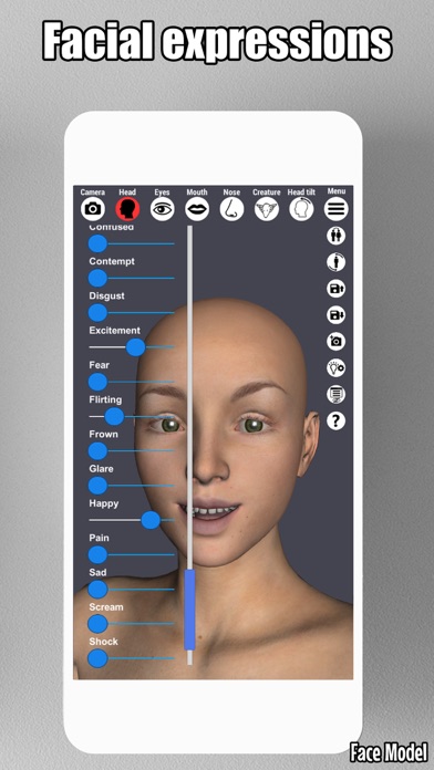 Ground-breaking and only head posing tool in the store with full face and head morphing capabilities. Hundreds of customizations to play with. Modify shape and size of the head, eyes, nose and mouth. App comes with realistic looking 3D male and female model. There are 17 pre-made facial expressions and 20 pre-made creatures (Aliens, demons, goblins, animals, zombie...)
