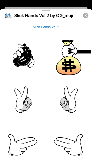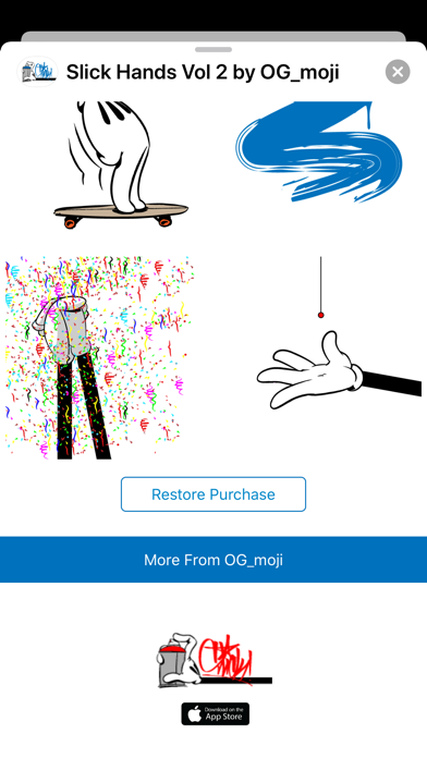 SLICKify yourself! Enhance your iMessages with SLICK HANDS Vol 2 by OG_moji! Legendary graff artist SLICK brings that street flav to the small screen. • SEND dynamic and animated stickers in chat • PLACE stickers anywhere on your iMessages • CUSTOMIZE your photos with stickers in chat • LAYER stickers over each other, in chat, and on photos • SCALE & ROTATE stickers