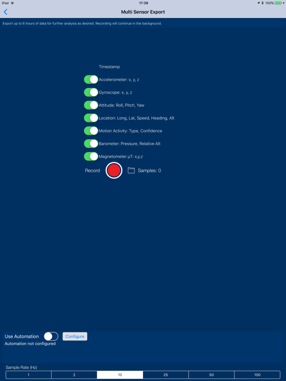 Background mode is supported for all recordings, accelerometer, gyro, and multi-sensor export, lock your screen and keep recording all sensor data for up to six hours.