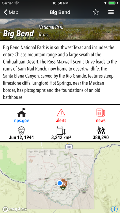 - Detailed national park information: alerts, news, visitor centers, campgrounds, driving directions, weather.
