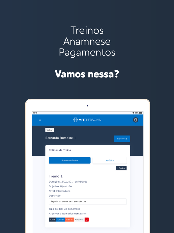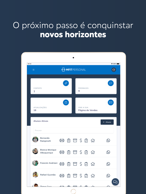 Prescreva treinos completos, controle pagamentos e acompanhe alunos de forma presencial e online direto pelo app.
