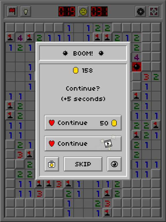 • Continue: If you hit a mine you can continue from where you left off for 50 coins or by watching a video ad