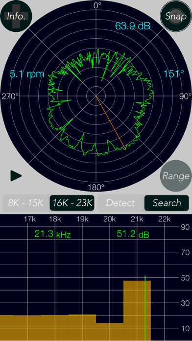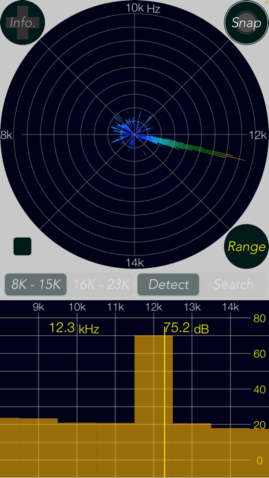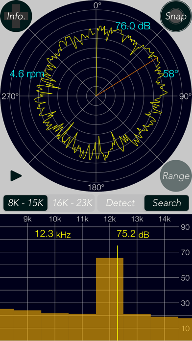 "Detect" can check if there are high frequency and ultrasonic sounds that you can not hear. "Search" can find the direction of high-frequency sound source. It can only be used when it has found the peak frequency in "Detect".