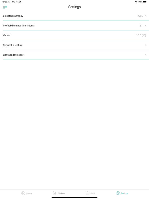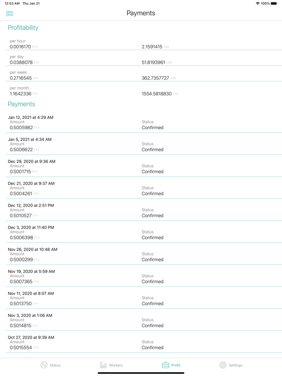 nanopool.org application for miner monitoring Provided features: - Real-time mining monitoring - Multiple monitoring addresses - Payment details - Projected income - Detailed statistics - Custom time interval - Multiple currency conversions - Rig hashrate and last share time - eth, etc, zec, pasc, sia, xmr, etn support