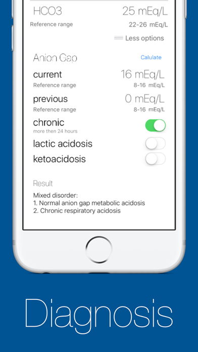 ABG Pro can help you diagnose acid base disorders based on the arterial blood gas analysis. Arterial blood gas is perhaps one of the most important test in the critically ill patient and can often be challenging to interpret. With the ABG Pro pocket tool you get fast help with an intuitive user-interface and a simple diagnostic rapport. ABG Pro also includes an Anion Gap calculator and handles situations with ketoacidosis as well as lactate acidosis.