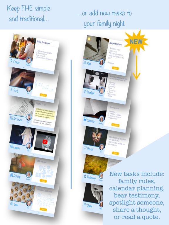 The Family Home Evening (FHE) app takes about five minutes to initially set up. From there, each weekly family night can be planned in one minute. It includes content (links and ideas for songs, lessons, activities and treats) for more than two years of Family Home Evenings without duplication. It’s clean, simple, customizable, and includes iMessage stickers. The content is from many Christian sources: The Church of Jesus Christ of Latter Day Saints (LDS), PragerU, FaithGrows, PrinceEa, etc.