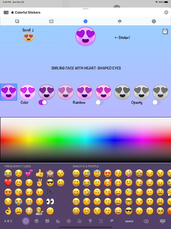 - Create stickers from the standard emoji keyboard. All emojis are available!