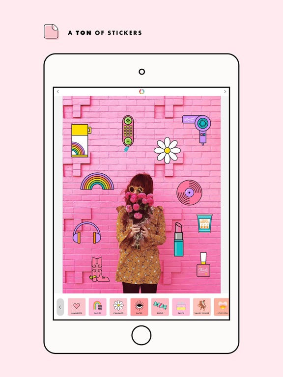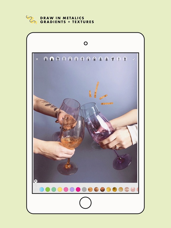 A Design Kit easily adds modern, colorful designs to your photos anywhere and everywhere. Start with the realistic brushes (maybe in gold!) to draw whatever you want. Then choose from over 30 modern fonts to say it exactly right. Anchor it with classic design. Or maybe just cover the whole thing in stickers or collages. This app has—
