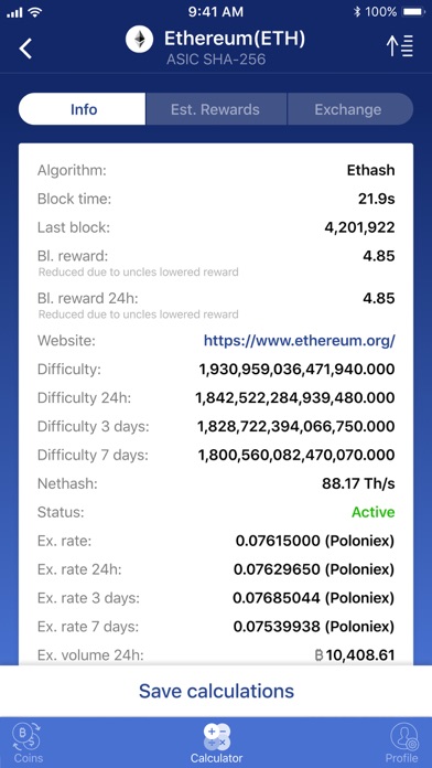 After the method and hardware is chosen and you read the information about the coin you can save calculator settings and get the data about mining results.