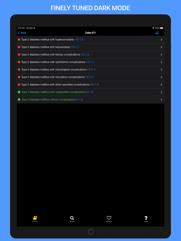 • Use the app's intelligent search engine to quickly find the code(s) that you need in the built-in database of over 120,000 codes, medical synonym and acronyms. No Internet connection required.