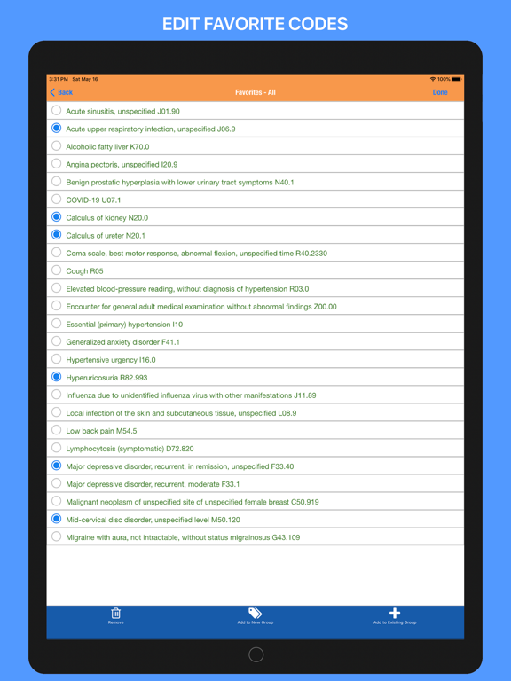 • Billable codes can be easily saved to a Favorites Library within the app. You can organize your favorite codes into an unlimited number of named groups. Use groups to assemble and order ICD-10-CM billable code tables that you can print, save and share. Use groups to quickly access codes or combinations of codes that you use often.