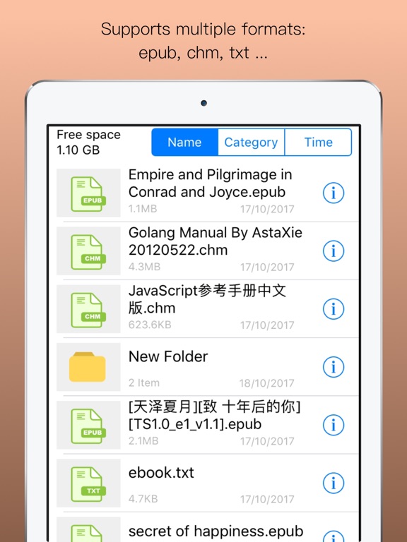 Epub Reader, providing a smooth ebook reading experience. Support viewing CHM, EPUB, PDF, RTF. Support to open the compressed package format ZIP, RAR, 7Zip, GZIP, TAR, CBZ, CBR. Key Functions: - Show the Table of Contents - Take notes - Add bookmarks - Add files using the desktop web browser or iTunes file share - Customizable font size contact us: [email protected]