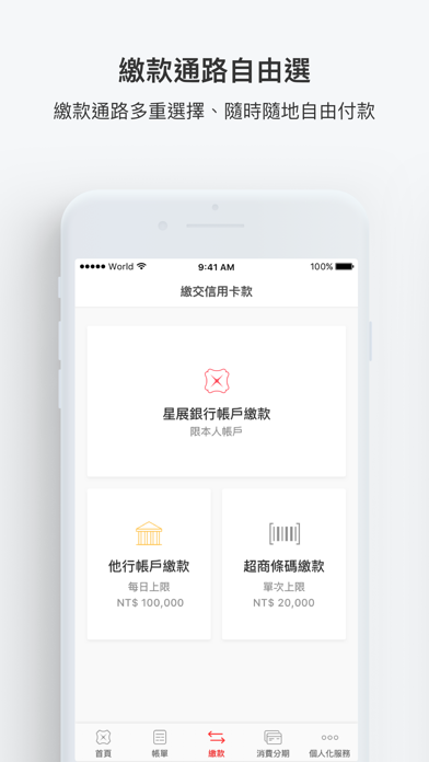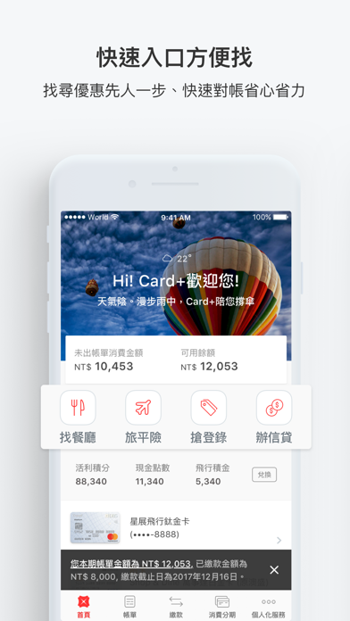 DBS Card+ 信用卡行動服務 讓您用卡隨興,星展隨行 【快速入口方便找】找尋優惠先人一步,快速對帳省心省力 【推播通知不漏接】消費通知最安心,繳款提醒好貼心 【在地優惠跟著走】悠遊國內外,隨時掌握附近優惠 【消費分期靈活購】分期付款輕鬆設定,生活消費靈活調配 【繳款通路自由選】繳款通路多重選擇,隨時隨地自由付款 【線上帳單隨手查】交易資訊一目瞭然,彈指之間即時掌握 【餐廳優惠輕鬆看】與EZTABLE合作,餐廳優惠一指訂位 【自助服務隨處享】線上開卡、申辦新卡、申請掛失,自助服務隨處可享 本App支援最新的指紋辨識登入,並且在登入失敗、變更個資時發送簡訊及電子郵件通知,讓您便利登入,又保護您的帳戶。提醒您 : 為確保行動裝置安全,建議您安裝最新作業系統版本。