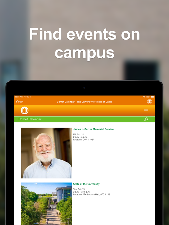 Stay connected to UT Dallas anytime, anywhere. From campus way finding, to information about the most current events and activities, to Comet sports and beyond, UTD Mobile keeps you informed.
