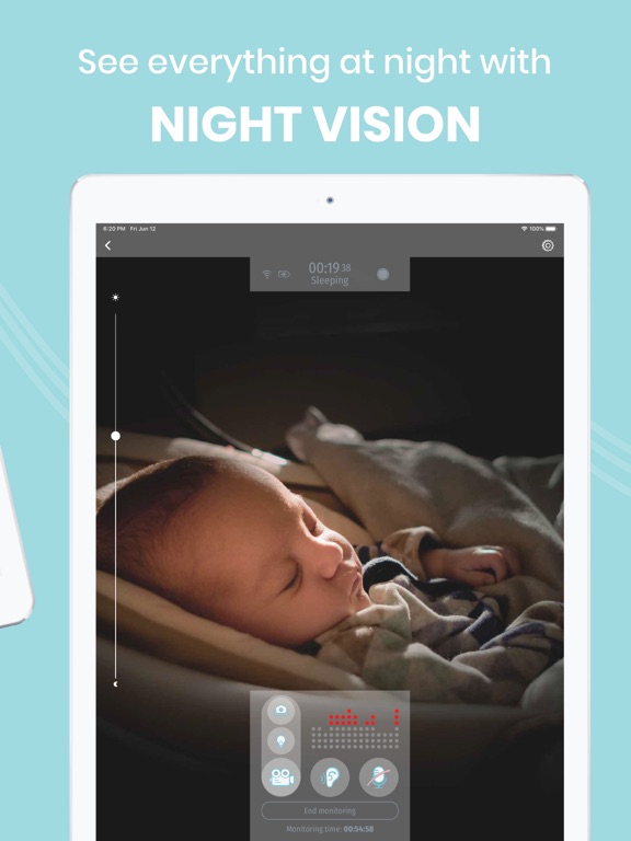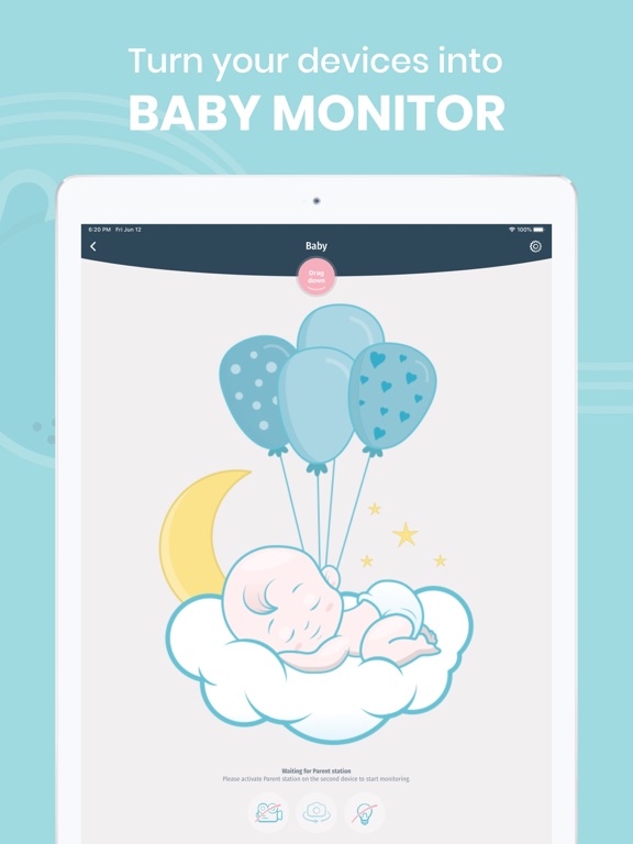 All you need is 2 iOS devices. One with the camera facing your baby and one to keep with you. Connect the devices through a 5 digit code. Just type it into the 2nd device and start monitoring!