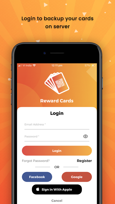 To backup your cards and make it available to your other devices, register on the Reward Cards app with your email or Facebook, Google or Apple account. With this backup, you can have access to your loyalty reward cards when you change your mobile phone and share them with your family or friends.