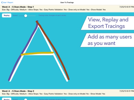 • Detailed reports provide information on what kids have done, including the ability to replay and export the tracings to view kids' progress