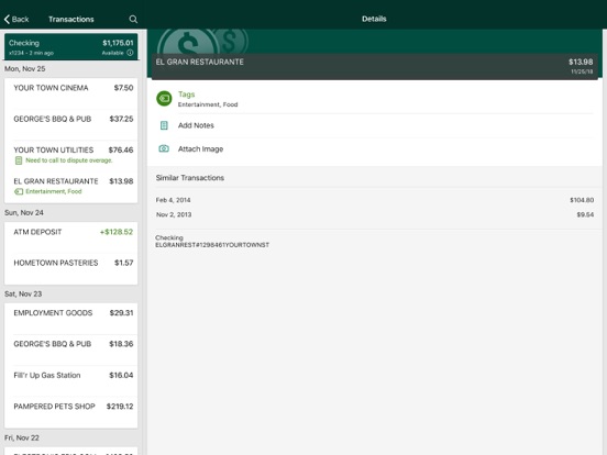 Add Tags, Notes, Images & Geo-Information: By enhancing transactions with custom tags, notes or photos of a receipt or check, you have the ability to stay organized and find exactly what you’re looking for when searching through your finances.