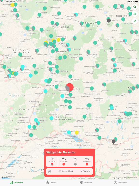 - Finden Sie stündlich aktualisierte Informationen zur Luftqualität einer Messstation in Ihrer Nähe oder aus Ihrer Favoritenliste.