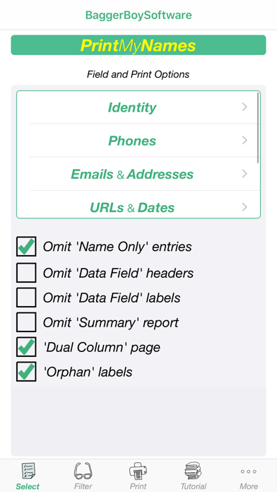 Note that the first four 'Screenshots' depicted above are actually 'Printershots' of the printed output of this app. The aspect ratios are somewhat distorted here (QR Code, for example) as they must conform to App Store screenshot pixel dimensions - but they look good on a printed page! The sample output shows the Contact 'data' found in the 'DataFields' selected in 'Screenshot' three. 'Printershot' three shows Contacts on mailing labels and number four is an index card.