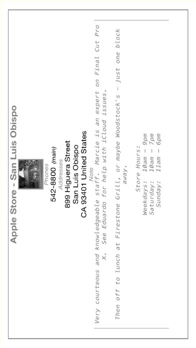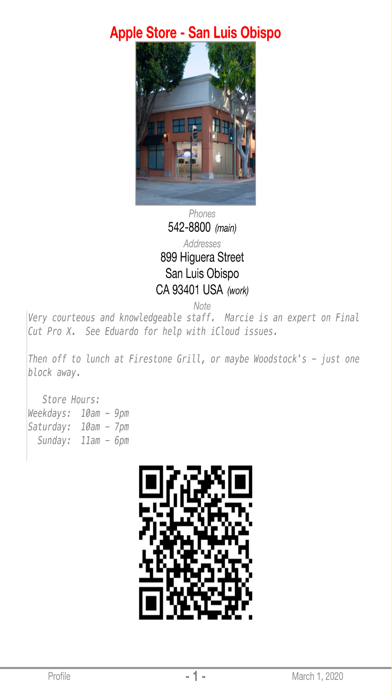 Also note the print of a Profile Page 'Photo', 'Note' and 'QR Code' from a Contact. Shown is the Apple Store in beautiful downtown San Luis Obispo, California, USA.